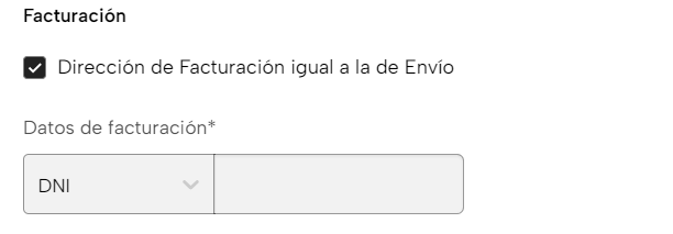 Si deseas que la dirección de facturación sea diferente a la dirección de envío, debes desmarcar la casilla “Dirección de facturación igual a la de envío”. De esta manera, podrás ingresar una dirección distinta para la facturación. En el apartado “Datos de facturación”: